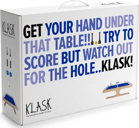 Klask er et hurtigt og energisk brætspil, der kombinerer airhockey, fodbold og magnetisk fingerfærdighed i én sjov og intens spiloplevelse. Det spilles på en træplade, hvor to spillere styrer magneter under bordet for at ramme den gule bold i modstanderens mål.